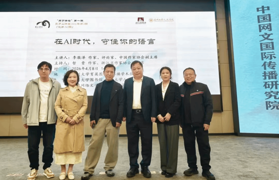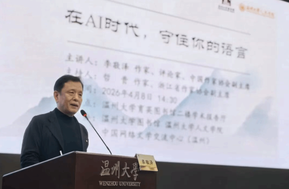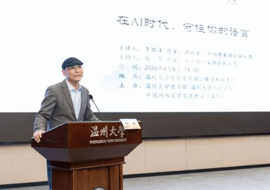2026年4月8日下午,著名作家、评论家、中国作家协会副主席李敬泽应邀莅临温州大学, 为师生带来题为《在AI时代,守住你的语言》的专题讲座。 本次活动由浙江省作家协会副主席哲贵主持,温州大学人文学院、温州大学图书馆、中国网络文学交流中心(温州)及温州大学中国网文国际传播研究院共同主办。温州大学校长赵敏出席并致辞,众多师生齐聚育英图书馆学术报告厅,共探人工智能浪潮下语言与人文的坚守之道。