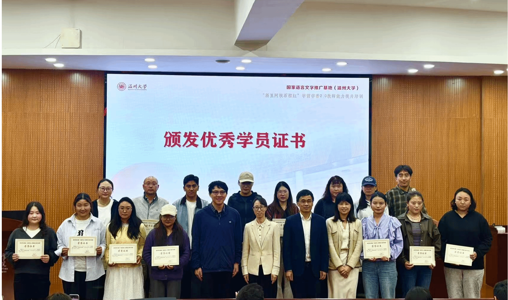 2025年10月21日至28日,由四川省阿坝州教育和体育局主办、国家语言文字推广基地(温州大学)承办、温州大学人文学院协办的“浙里阿坝石榴红”学前学普2.0教师能力提升培训项目在温州大学成功举行,来自四川省阿坝州8个县(市)的100名藏、汉、羌、彝和土家族老师参加学习。