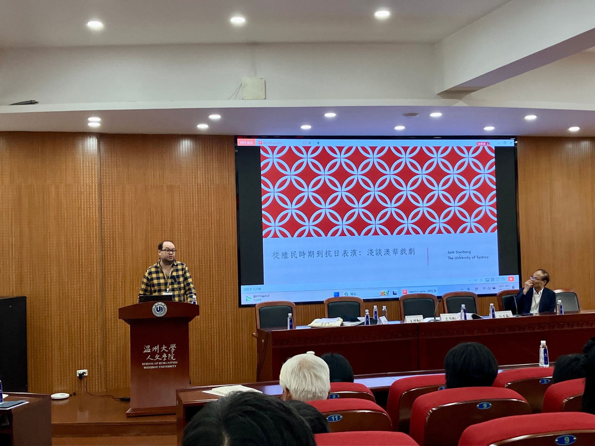 开幕式后,由温州大学文科资深教授俞为民教授主持本届大会主题发言,南京大学孙书磊教授与悉尼大学Josh Stenberg教授(中文名:石峻山)先后作主题报告,题目分别为《理念、领域与方法:钱南扬南戏研究的学术史意义》和《联邦到二战的澳华戏剧》。