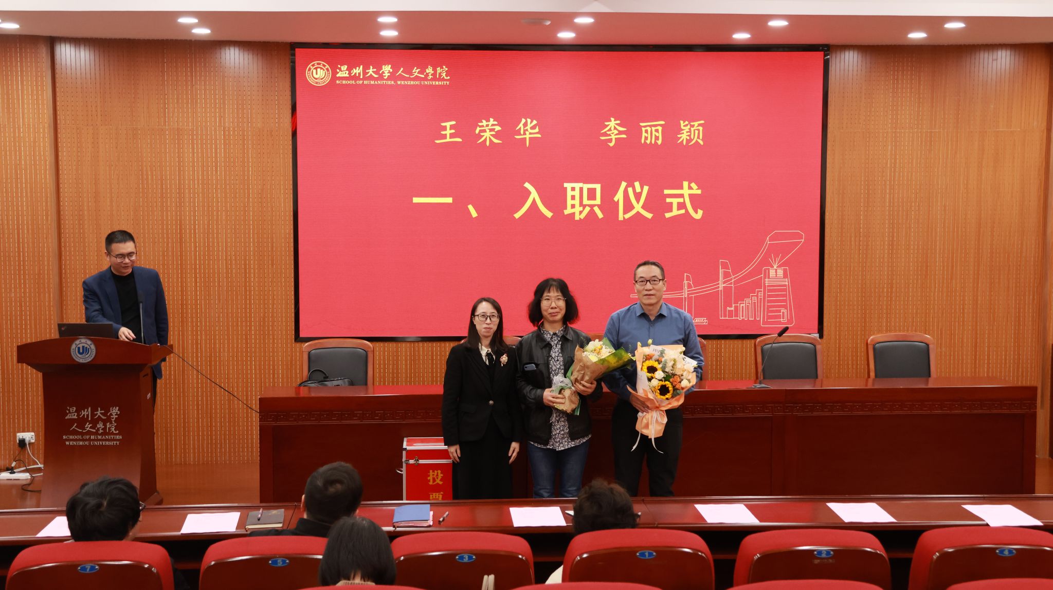 首先,会议举行新教师入职仪式。陈源源副院长为王荣华、李丽颖2位新教师送上鲜花,并对他们的加入表示热烈欢迎。