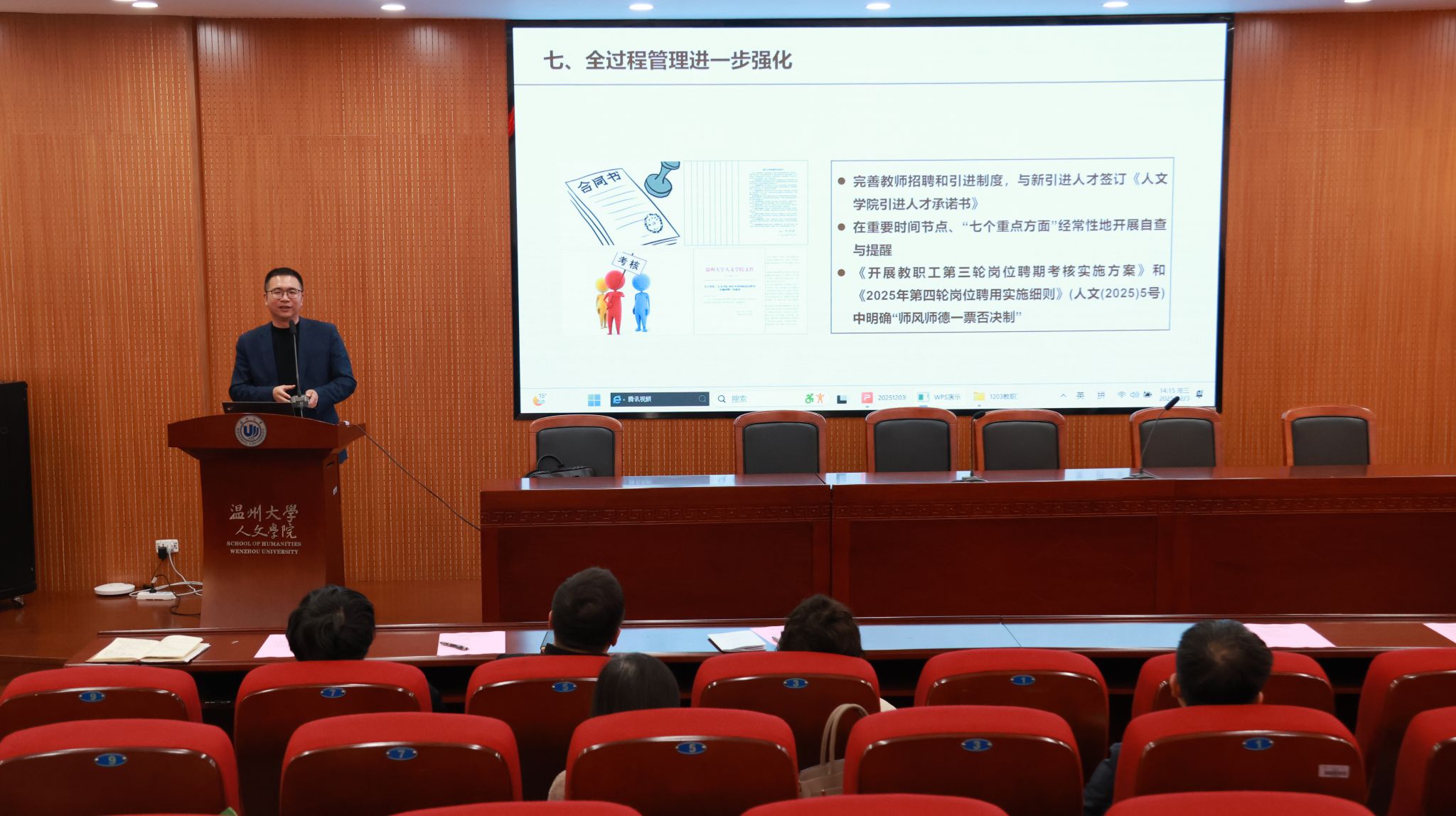 2025年12月3日,人文学院在203会议室召开教职工大会暨师德师风专题学习会。会议由江秀景主持,学院全体教职工共同参加。
