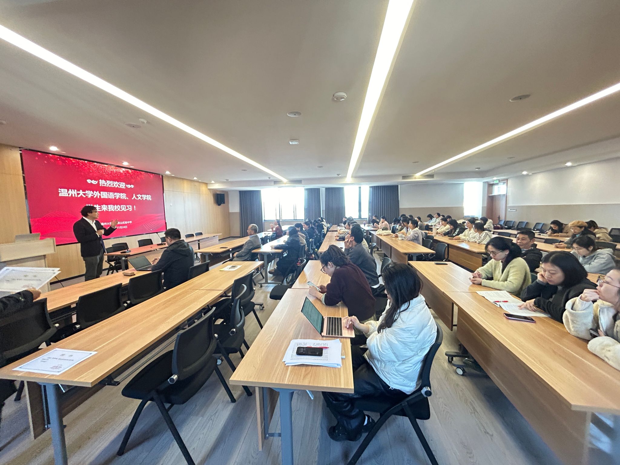 24日上午,23历本的庞德莉、卓嘎等8位同学在陈鸿超副院长和冯高峰老师的带领下走进了温州大学附属茶山实验中学。见面会上,陈鸿超老师就本次见习的时间安排、任务要求和相关制度作了详细说明,鼓励同学们珍惜机会、主动学习、积极实践。与此同时,李婷婷、向柯怡等6位同学在赵银林老师的安排下前往温州榕园学校;其他同学们也各自前往不同的中学开始了见习活动。