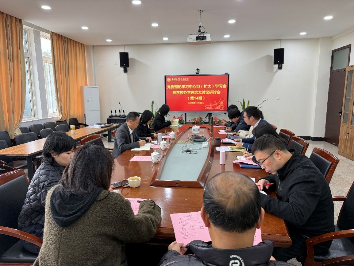 随后,党委理论学习中心组成员围绕学校办学定位、学科建设、人才培养、服务地方等展开深入讨论,并提出一系列建设性意见。本次会议前,学院还专门制定大讨论实施方案,组织全院师生围绕“学校高水平大学建设与学院‘十五五’发展规划编制”召开多场座谈会,听取师生意见建议。