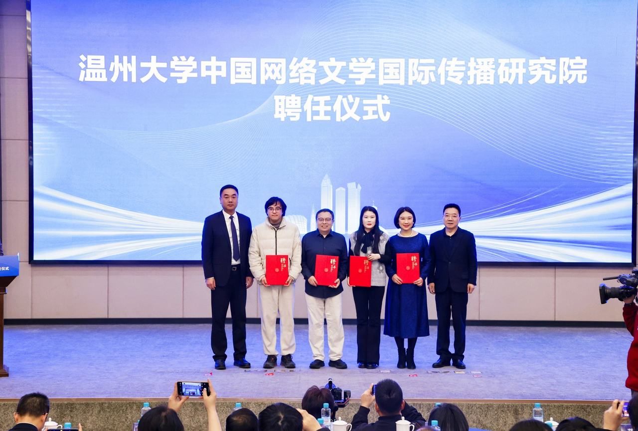 现场还举办了中国网络文学交流中心(温州)授牌暨温州大学中国网文国际传播研究院成立仪式。浙江省网络作协副主席、温州大学研究员蒋胜男受聘为研究院院长,温州大学人文学院瓯江特聘教授乌兰其木格受聘为执行副院长、温州大学瓯江特聘教授管平潮、温州大学人文学院副教授黄家光受聘为副院长;中南大学网络文学研究院院长欧阳友权、中国社会科学院研究员白烨、中国社会科学院大学教授陈定家、中国作协网络文学研究院研究员马季、安徽大学教授周志雄、河北省网络作协副主席桫椤、温州大学人文学院党委委员鲍良兵、温州大学中文系副主任李广旭等专家受聘为特聘研究员。