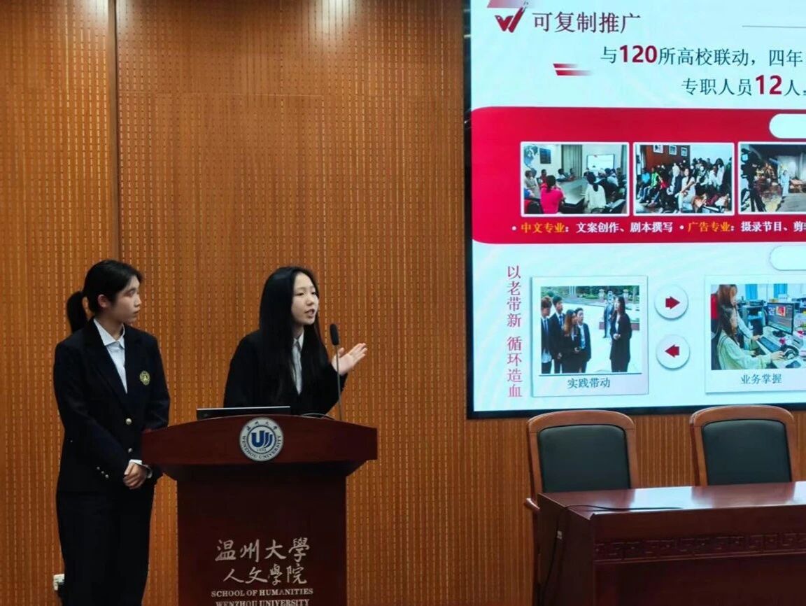 竞赛现场,各项目组在有限的时间内充分展现项目特色与创新价值。“口述共富”团队致力于文化记忆的定制与传承,“轩语纪”项目探索AI技术在社区广告服务中的创新应用,“纸来纸往”将传统纸艺与现代科技巧妙融合,“瓯声朗朗”聚焦中国故事的海外传播。这些项目既体现了人文学科的专业特色,又展现了跨界融合的创新思维,充分彰显了当代大学生敏锐的市场洞察力和强烈的社会责任感。