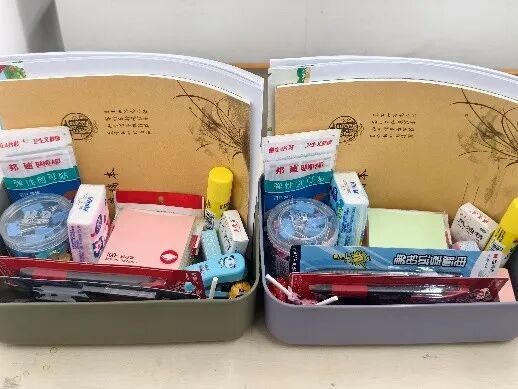 24中本3班的同学们用班费购置了物资,在逸夫图书馆和育英图书馆的入口处,摆了两个贴着“暖心加油站”标识的收纳盒,格外引人注目。盒内整齐摆放着草稿本、便签、彩色长尾夹、订书机、涂卡笔、中性笔、固体胶等学习用品,还有棒棒糖、创可贴、风油精、餐巾纸等生活小物,一应俱全,供有需要的师生免费使用。