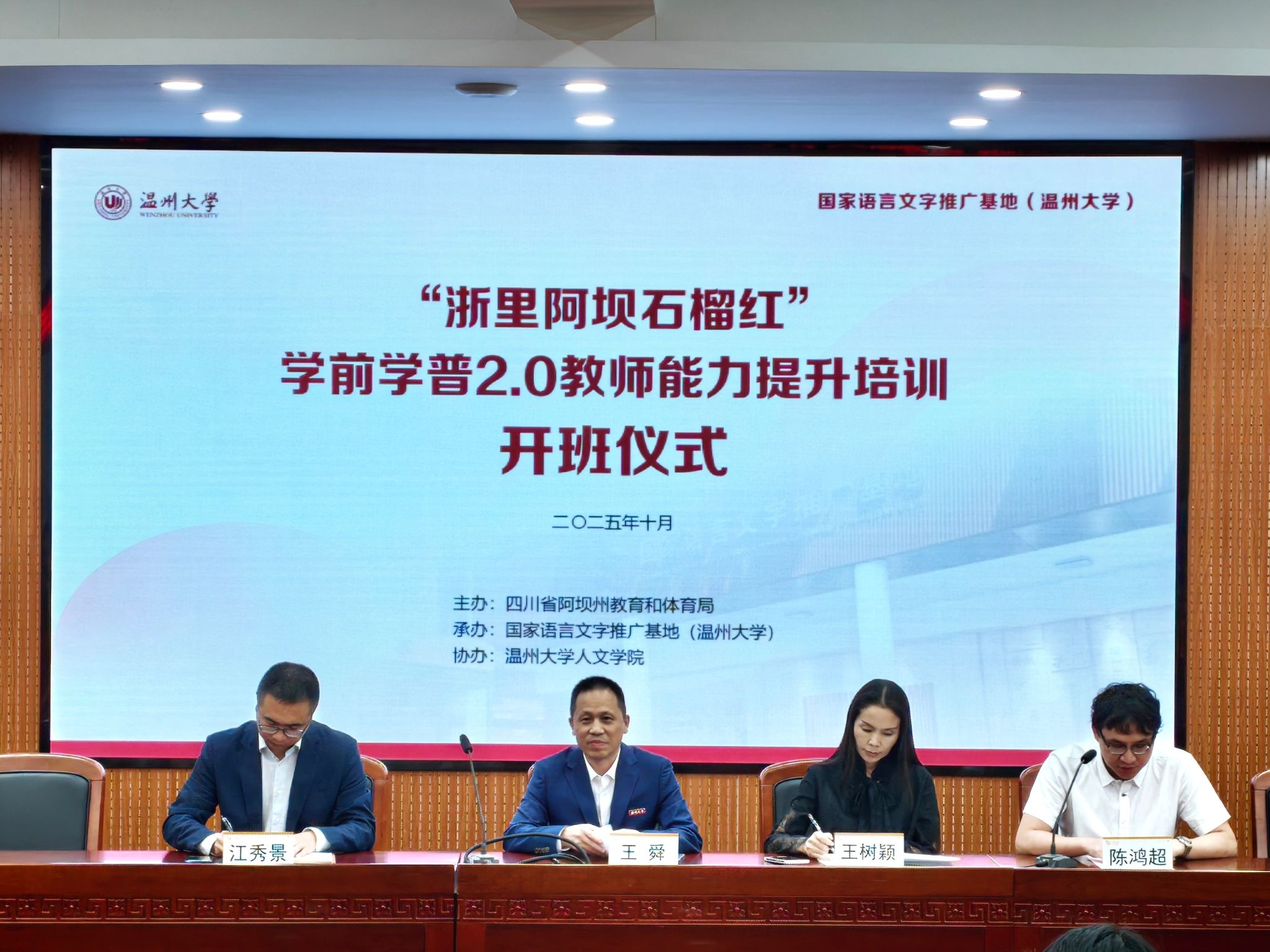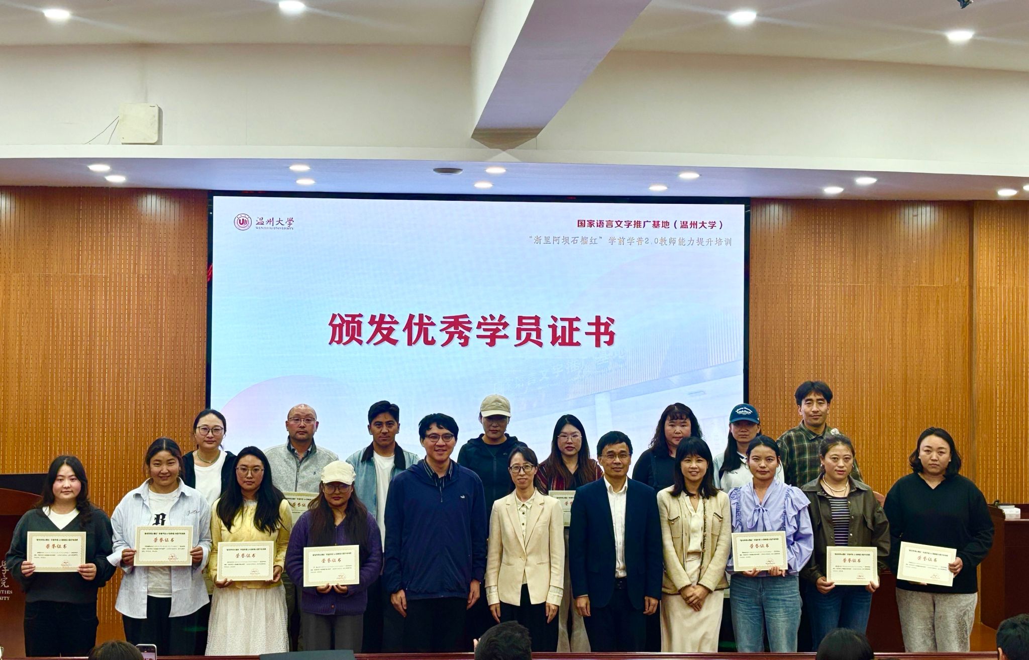 近日,由四川省阿坝藏族羌族自治州教育和体育局主办、国家语言文字推广基地(温州大学)承办、温州大学人文学院协办的“浙里阿坝石榴红”学前学普2.0教师能力提升培训班在温州大学举办。来自阿坝州8个县(市)的100名藏族、汉族、羌族、彝族与土家族老师参加学习。