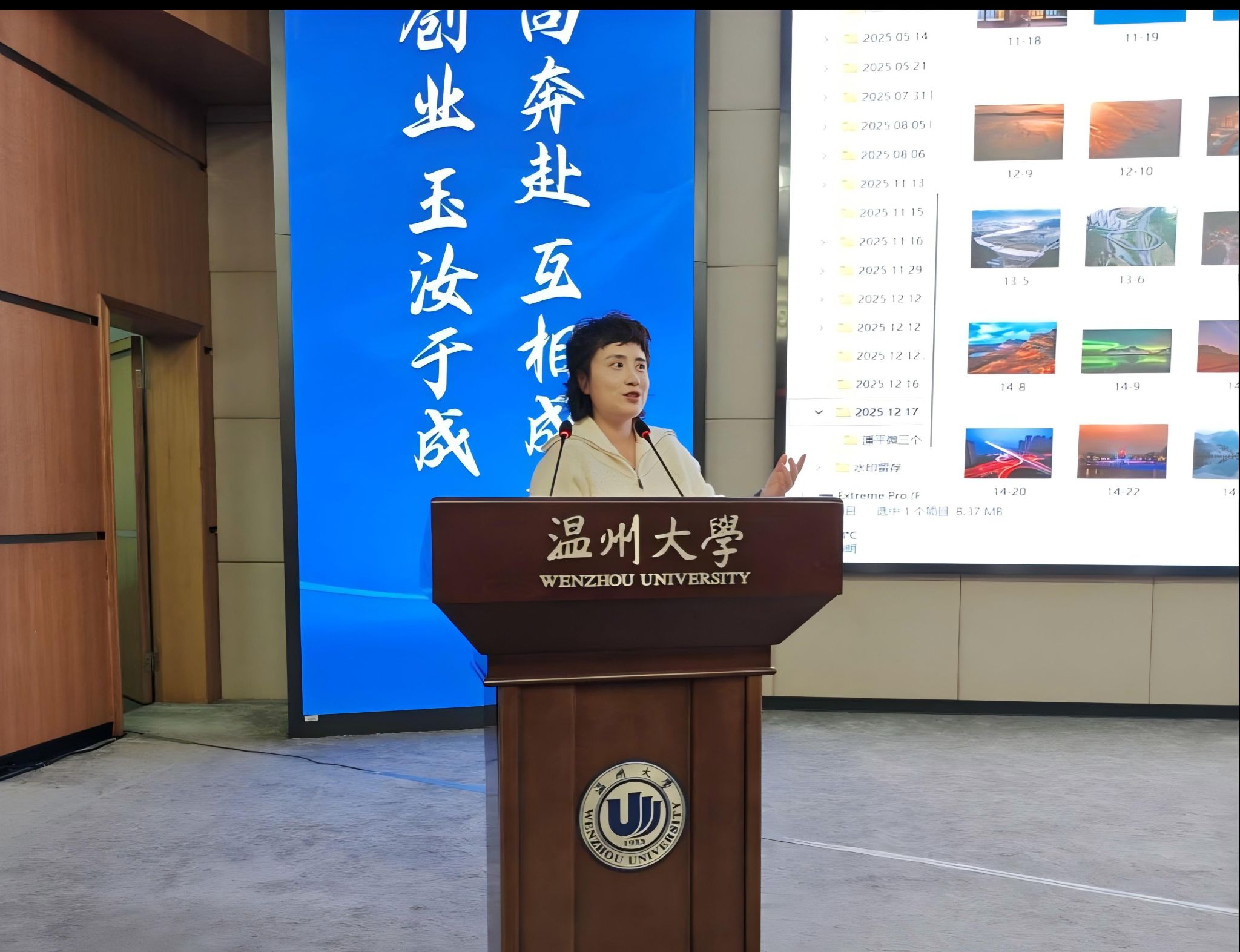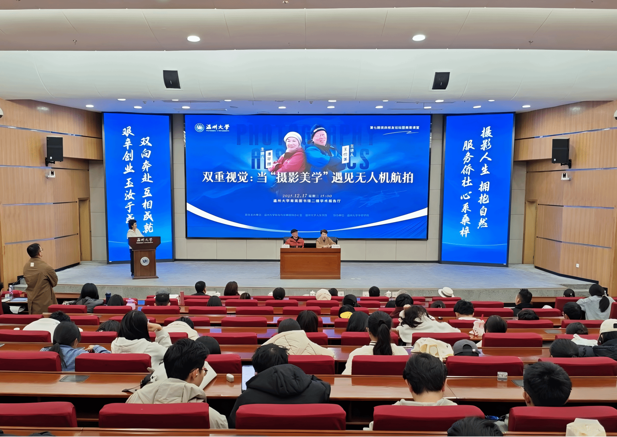 12月17日下午,温州大学第七期贤庆校友论坛暨美育课堂在温州大学育英图书馆学术报告厅顺利举行。本次活动以《双重视觉:当“摄影美学”遇见无人机航拍》为主题,邀请中文系1978级校友王俭美、潘平微重返母校,与师生及摄影爱好者展开关于视觉艺术与科技融合的深度对话。